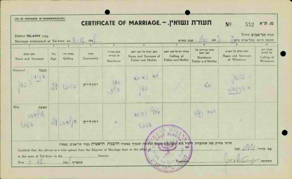 7.12.1948 Heirat in Tel Aviv mit Benjamin Kohn, Kfar Szold