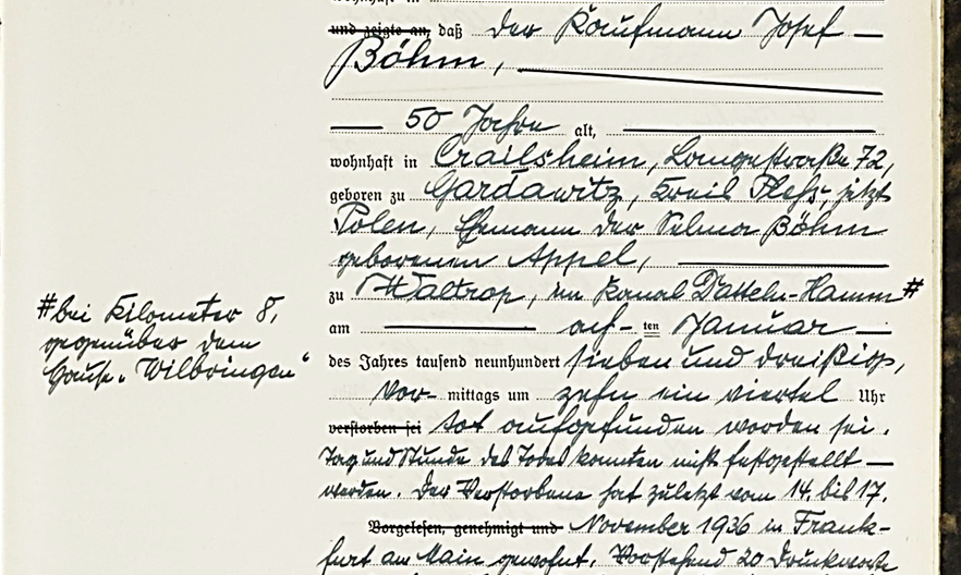 8.1.1937 in Waltrop, im Kanal Datteln-Hamm bei Kilometer 8 gegenüber dem „Haus Wilbringen“ als Wasserleiche aufgefunden