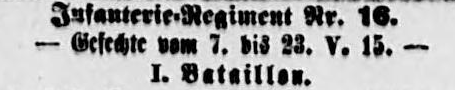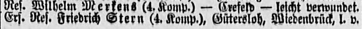 Bruder Friedrich Stern am 11.2.1915 und erneut am 3.6.1915 als Ers. Reservist der 4. Kompagnie des 1. Bataillons des Infanterieregiments 16 in den Preußischen Verlustlisten zweimal „leicht verwundet“ gemeldet