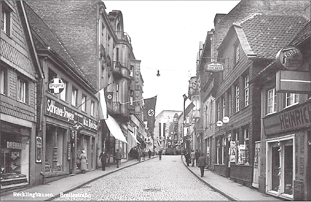 „Erinnern kann ich mich noch, daß ich in der Nacht durch Lärm geweckt wurde. Als ich aus dem Fenster unserer Wohnung im 2. Stockwerk auf die Straße schaute, waren die Schaufenster des Geschäfts der Familie Tepper wohl schon zerstört. Ich sah uniformierte SA-Männer und meine auch, mich an einen offenen Lastwagen zu erinnern. Später in der Nacht klingelte es bei uns an der Wohnungstür und ein SA-Mann tauchte auf. Mein Vater kannte ihn aus der Stadt. Er war wohl alkoholisiert, bedrohte meinen Vater mit der Pistole und schimpfte: ‚Euch müsste man auch…‘. An den genauen Wortlaut kann ich mich nicht mehr erinnern. Unsere Wohnung wurde zwar nicht zerstört, aber wir waren so verängstigt, daß unsere Familie am nächsten Morgen sofort nach Bochum fuhr, wo man uns nicht kannte. Wir hielten uns dort den ganzen Tag auf aus Angst, daß in Recklinghausen noch mehr passiert. Mein Vater wurde dann einige Tage später auch verhaftet.“