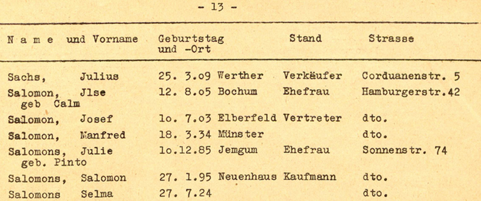 1939 auf der von der Stadtverwaltung erstellten Liste der noch in Münster ansässigen Juden mit der ebenfalls aus Bochum stammenden Ilse Salomon geb. Cahn/Kahn