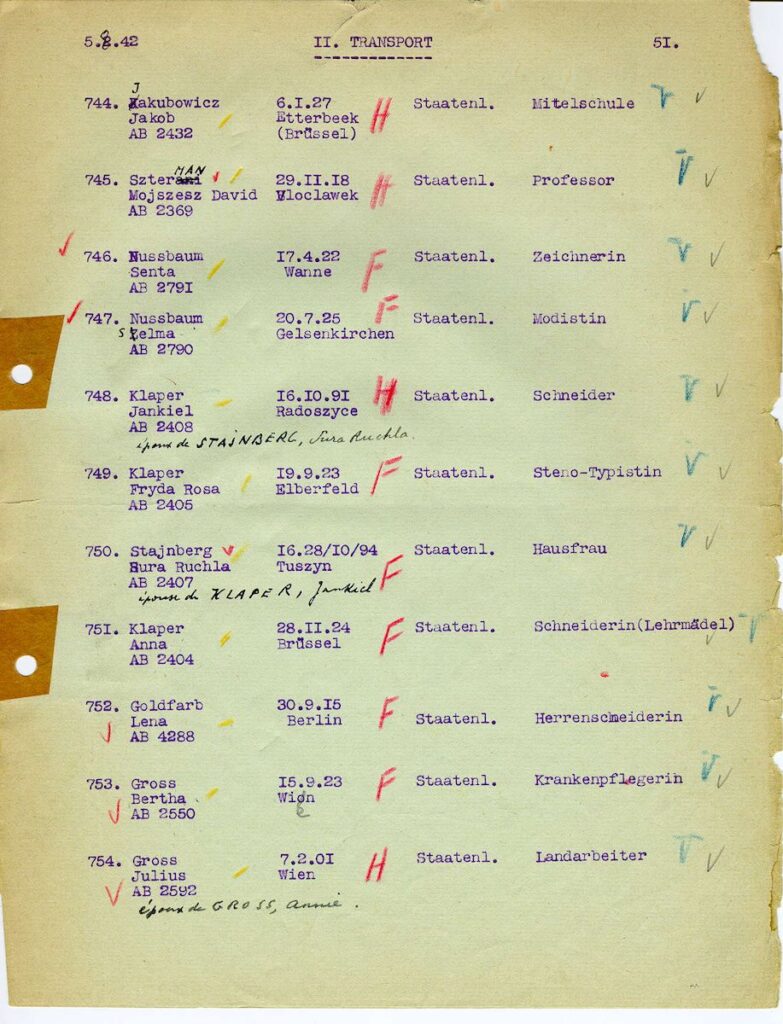 5.8.1942 Senta und Cousine Selma Nussbaum auf dem II. Transport ab Mechelen nach Auschwitz