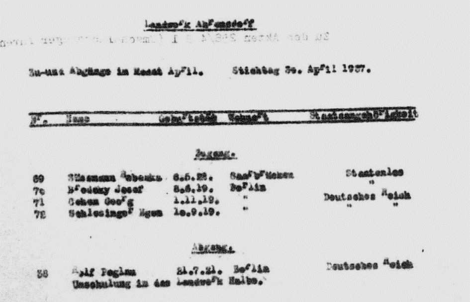 April 1937 als Ausbilder aus Ahlem für die landwirtschaftlichen Ausbildung ins Hachscharalager Ahrensdorf zusammen mit Josef Brodsky und Egon Schlesinger, beide aus Berlin