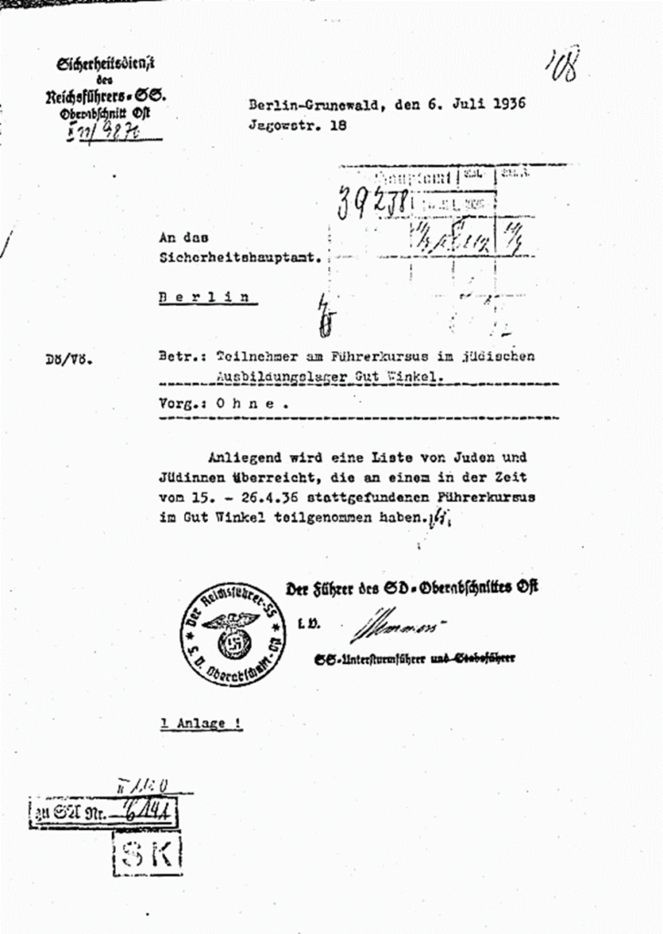 6.7.1936 SD Gestapo Oberabschnitt Ost an das Reichssicherheitshauptamt RSHA: Liste der 64 Teilnehmer am Führerkursus des Makkabi Hazair, 15.-26.4.1936 in Gut Winkel
