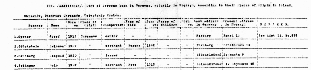 Liste der Zbaszyn-Deportierten, die Verwandte im Ausland haben, erstellt in Krakau August 1939