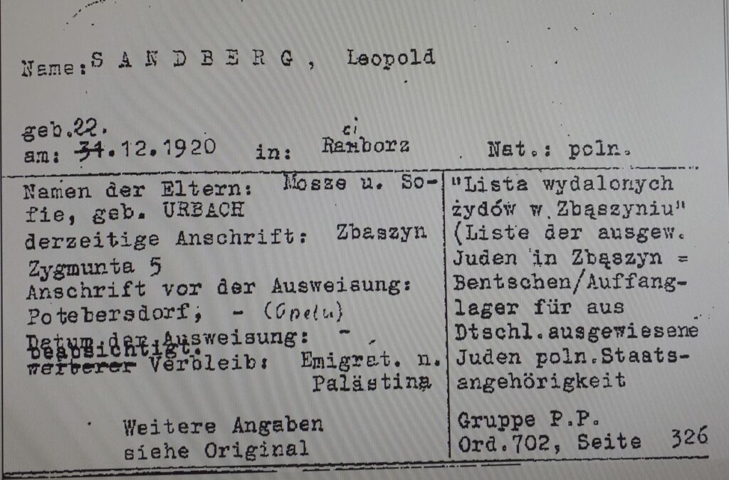 28.10.1938 Leopold Sandberg verhaftet in Steckelsdorf und ausgewiesen in der ersten Polenaktion, deportiert nach Zbaszyn