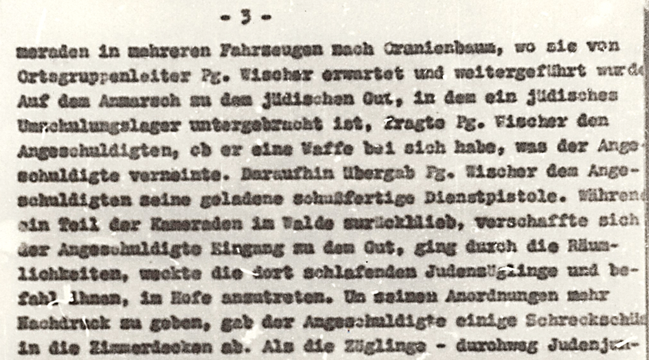 Bereits in der Reichspogromnacht brachen die Nazis in das Lagergelände ein, steckten die Jugendlichen in der Kälte des Novembers in Nachtkleidung auf den Hof und ermordeten zwei Jungen. Sie wurden heimlich auf dem christlichen Friedhof in der Stadt Gräfenhainichen bestattet, und die Lage der Gräber wurde erst vor kurzem bekannt. Die Nazis verschleierten die ganze Angelegenheit, indem sie ihnen verboten, das Ausbildungsprogramm für ein paar Tage zu verlassen, ihnen ausdrücklich verboten, über das Thema zu sprechen, und die Pioniere einschüchterten.“