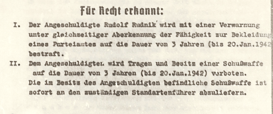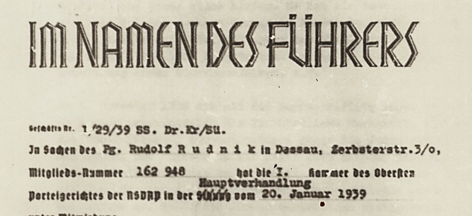 20.1.1939 Hauptverhandlung des Parteigerichtsverfahren gegen den Mörder Rudolf Rudnik; Auszüge aus der Akte: