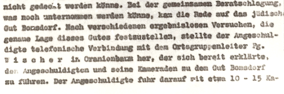 „Das in Bomsdorf vorhandene jüdische Eigentum wie zum Beispiel Vieh, Futtervorräte und andere Einrichtungsgegenstände holten sich im wesentlichen führende Nazis aus den umliegenden Orten.“