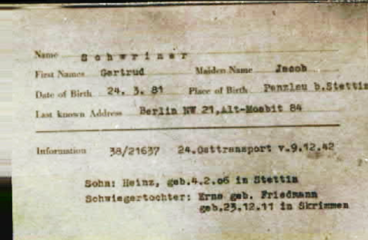 9.12.1942 Mutter Gertrud, Bruder Heinz und dessen Frau Erna Schweriner auf dem 24. Osttransport von Berlin nach Auschwitz
