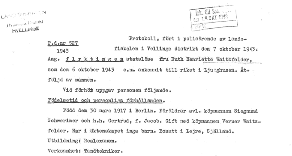 6.10.1943 Ankunft von Ruth und Kurt Waitzfelder in Ljunghusen, Schweden.