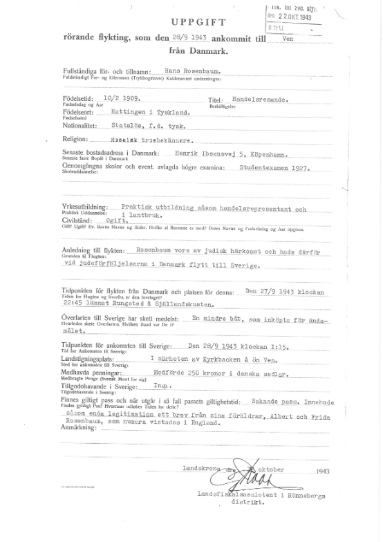 27.9.1943 Hans Rosenbaum mit einem kleinen Boot von Rungsted, Dänemark nach Schweden