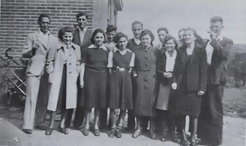Vorn Hetty Stern, Edith Keizer (zu Besuch), Betty Cohen, Adina van Coevorden (zu Besuch), Carry Denneboom, Gonnie van Oosten