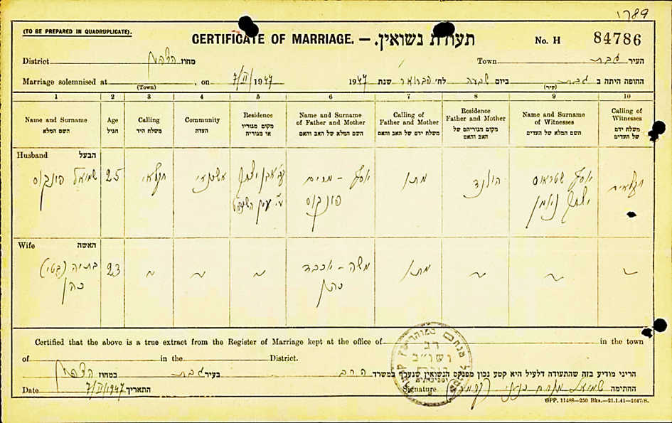 Heirat Betty Cohen *1923; ✡7.11.1997 (Eltern Moses Cohen und Jochewed Philips)