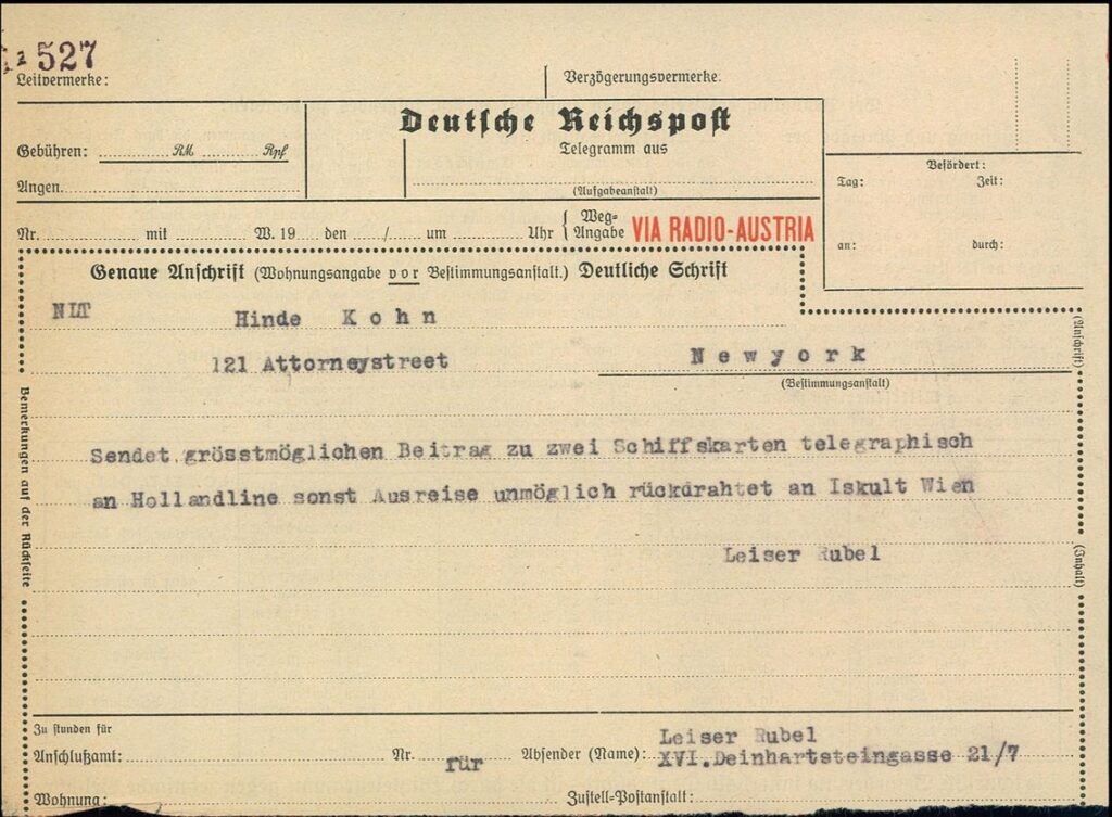 Telegramm von Vater Leiser an Schwägerin Hinde Kohn in New York