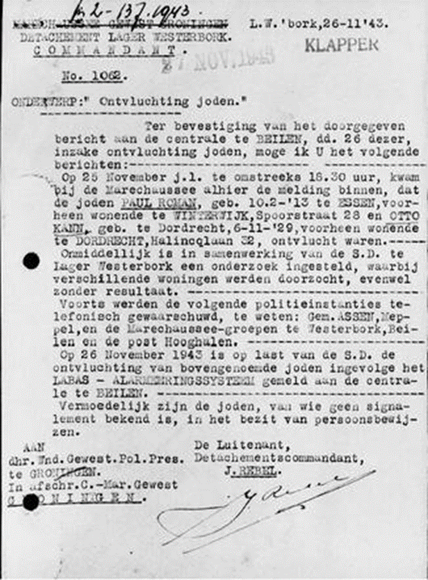 Paul Romann gelingt am 25.11.1943 die Flucht zusammen mit dem 14-jährigen Otto Kann aus Westerbork, er wird aber schon fünf Tage später in Amsterdam wieder festgenommen.