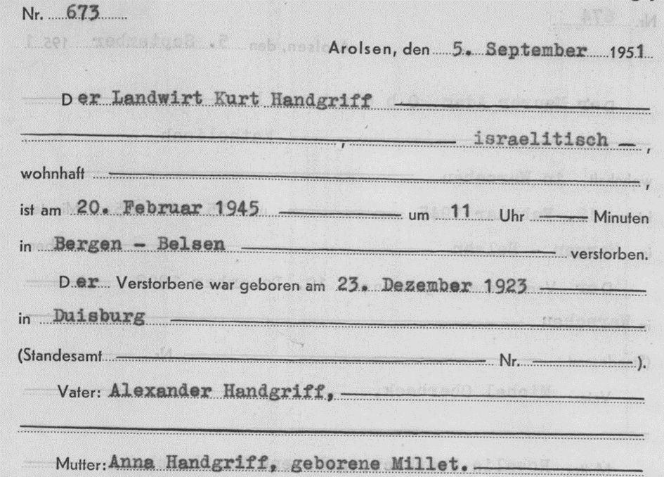20.2.1945 Tod von Kurt Handgriff in Bergen- Belsen, noch bevor die „Austauschjuden“ am 10.4.1945 auf die drei Züge Richtung Theresienstadt gesetzt werden.