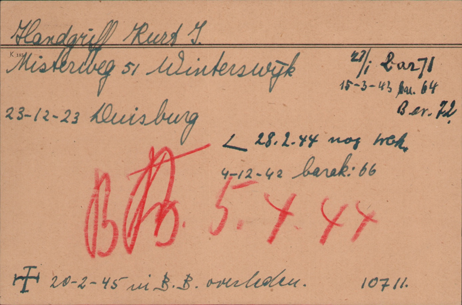 4.12.1942 Einweisung in das polizeiliche Judendurchgangslager Westerbork; Kurt Handgriff zunächst auch in der Strafbaracke Nr. 66; später ist er in verschiedenen Baracken untergebracht, auch in der Baracke der Chaluzim der Westerbork-Hachschara Nr. 64