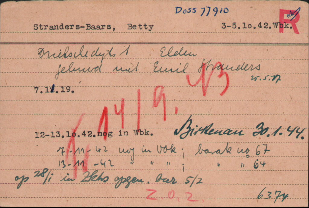 14.9.1943 Deportation von Emil und Betty Stranders mit der Gruppe der über 20-jährigen Chaluzim nach Auschwitz; auf diesem Transport befanden sich mehrere orthodoxe Chaluzim u.a. Ernst Cosmann, Heinz Friedländer, Arnold Erlanger, Karl Elias und Erwin Moses. Nur Betty Stranders und Erlanger kamen zurück.