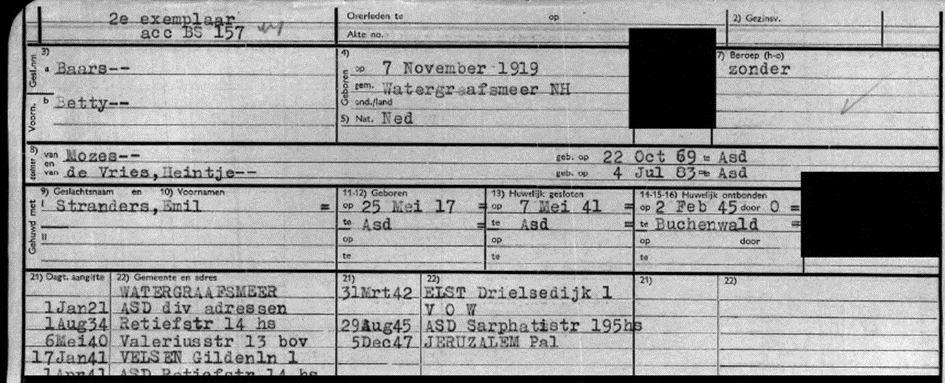 Heirat 28.2.1942 in Amsterdam mit Emil Stranders *25.5.1917 in Amsterdam; ✡ 2.2.1945 im KL Buchenwald