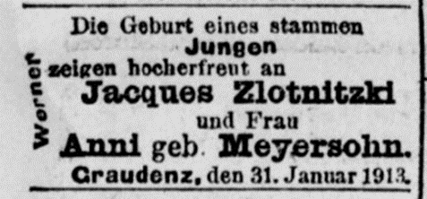 Werner Zlotnitzki *31.1.1913 in Graudenz; ✡ 7.10.2014 in Buenos Aires; oo Ursel Jerich (1914-1983)