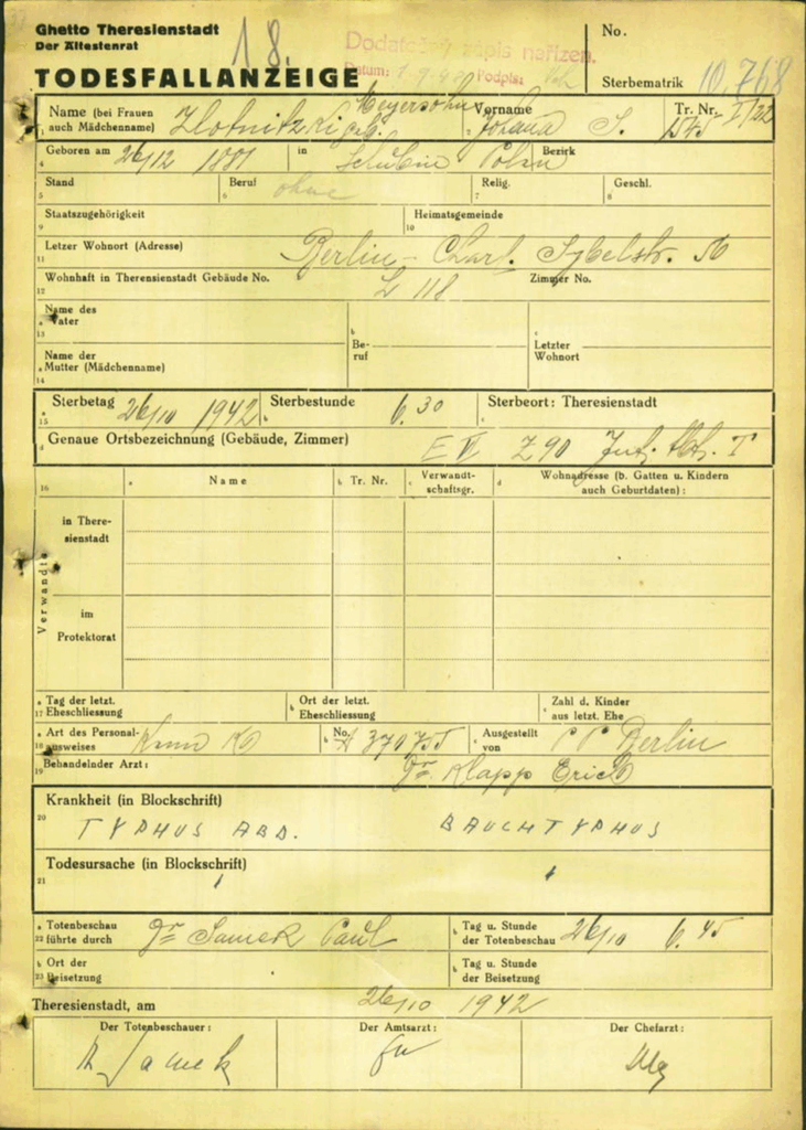 26.10.1942 Tod der Ehefrau Johanna in Theresienstadt mit Bauchtyphus
