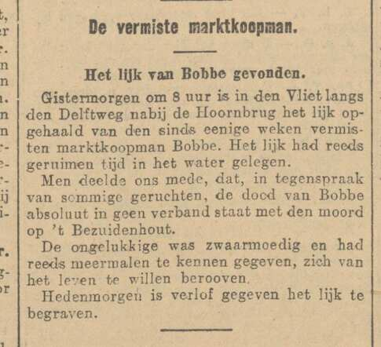 17.2.1927 Suizid des Vaters in Rijswijk; seine Leiche wird im Vliet am Delftweg aus dem Wasser geholt, nachdem er seit einigen Wochen vermisst war. Er hatte mehrfach angekündigt, seinem Leben ein Ende setzen zu wollen.