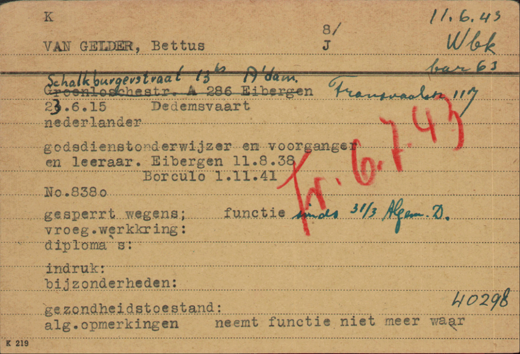 1.11.1937 Bettus van Gelder abgemeldet aus Franeker nach Ommen: Er tritt dort eine Stelle als Religionslehrer an.