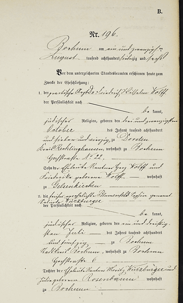 Heirat 21.8.1876 in Bochum Sophie „Selinde“ Blumenfeld geb. Würzburger