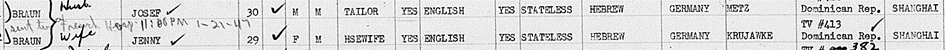 12.4.1946 in Shanghai Ausstellung eines Passes der Dominkanischen Republik für Josef Braun und Ehefrau Jenny