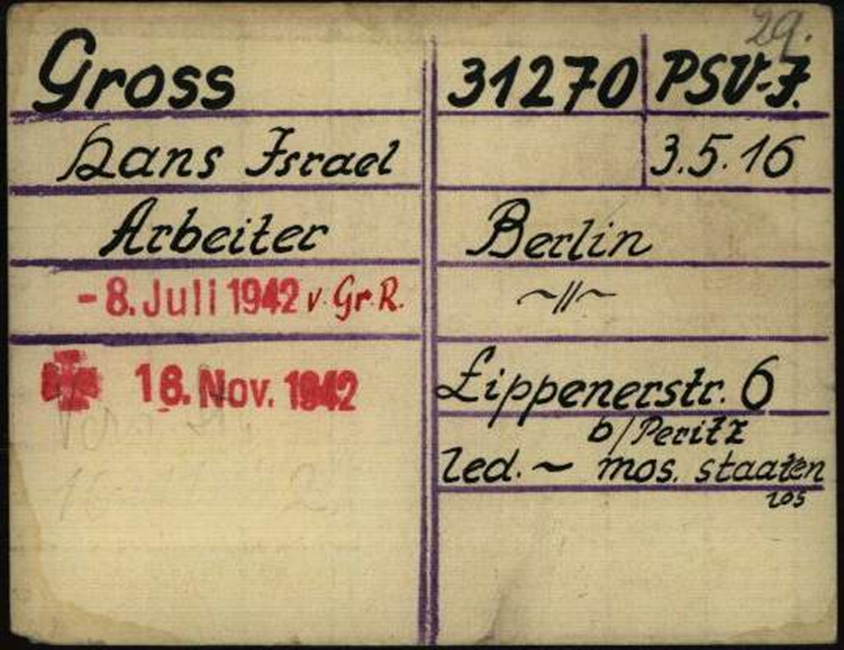 8.7.1942 Verlegung von Hans Gross als BV-Jude von Groß-Rosen in das KL Dachau; (BV – Kürzel für „Befristete Vorbeugehaft“, fälschlich „Berufsverbrecher“)