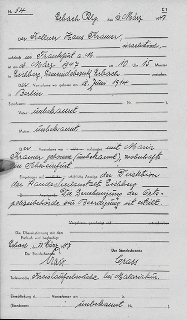 13.3.1947 Tod von Hans Kramer in der Landesheilanstalt Eichberg (Psychiatrie), Erbach wegen „Kreislaufschwäche bei Malariakur“
