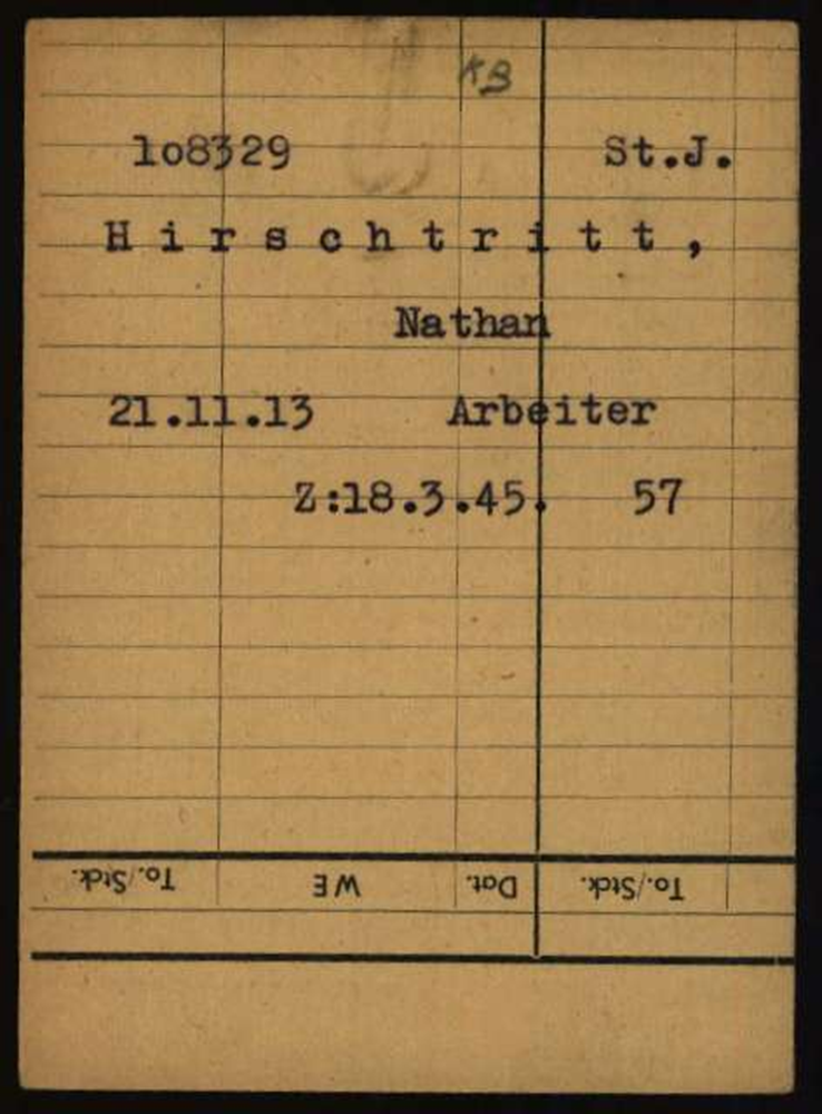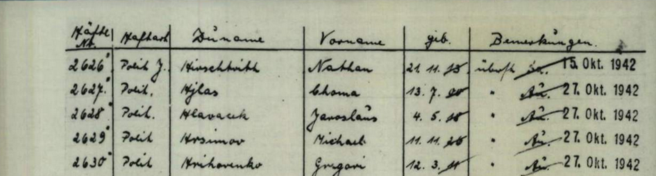 22.10.1942 Überstellung von jüdischen polnischen Häftlingen aus dem KL Sachsenhausen in das KL Ausschwitz zum Ausbau des BUNA-Werks in Auschwitz Monowitz; auf diesem Transport befanden sich neben Nathan Hirschtritt, Horst Jonas, Adam König auch Abraham Matuszak.