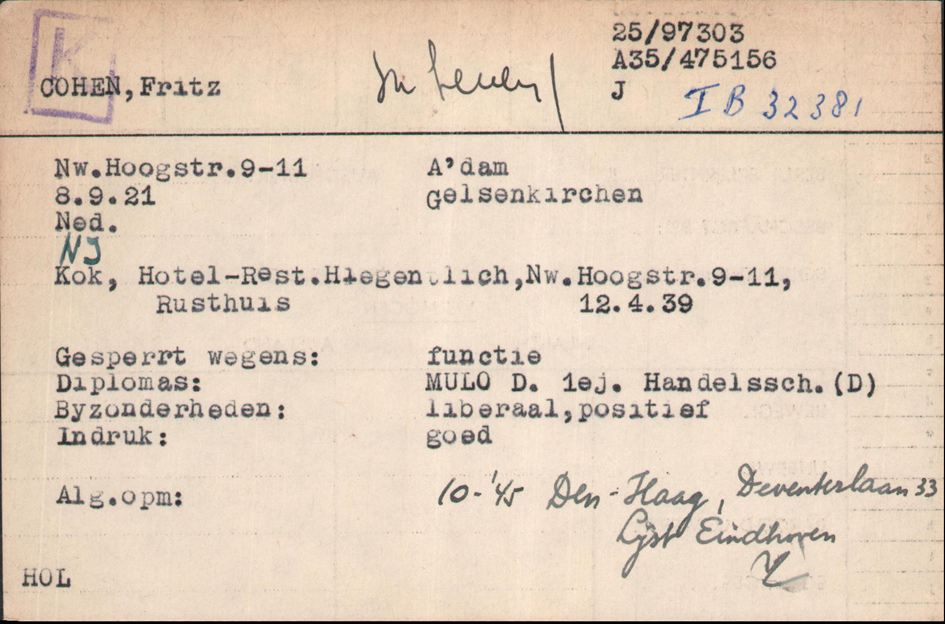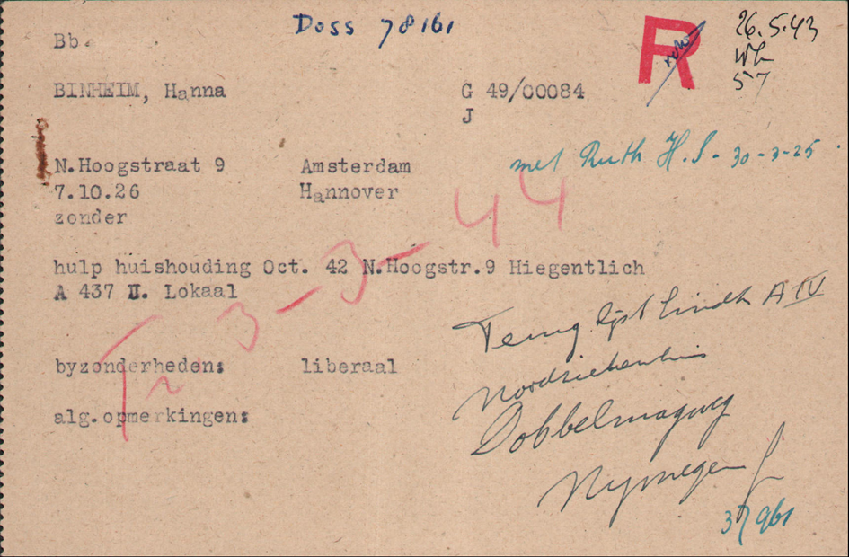 31.5.1940 Schwester Ruth in das Hotel Hiegentlich, Amsterdam, Nieuwe Hoogstraat 9/11; auch Hannah Binheim arbeitet hier als Haushilfe