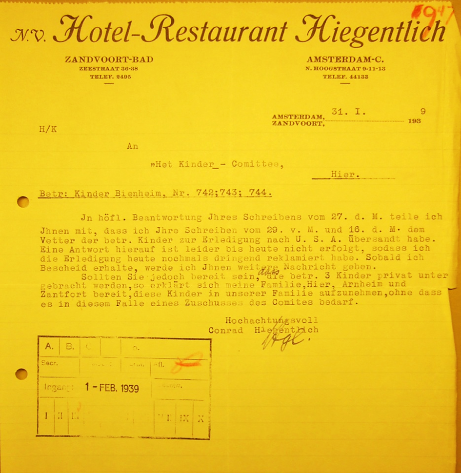 Conrad Hiegentlich erklärt sich bereit, die drei Geschwister Binheim aufzunehmen, der Antrag wird vom Kindercomitee abgelehnt