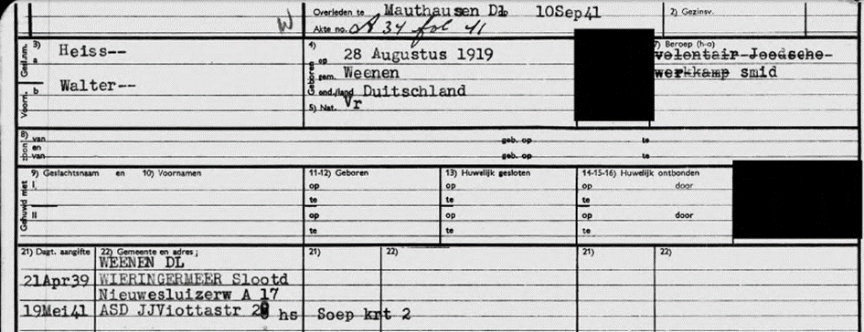 27.3.1941 Unterbringung der Werkdorper in Gastfamilien oder bei Verwandten; Walter Heiss nach Amsterdam, J.J. Viottastraat 20-II bei Familie Soep