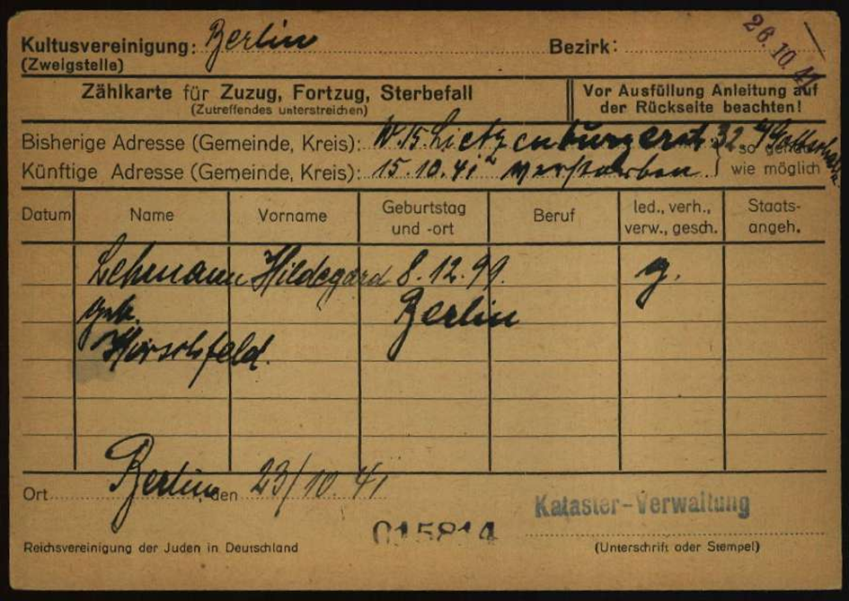 Mutter Hildegard Caroline Hirschfeldt *8.12.1889 in Berlin; ✡ 15.10.1941 in Berlin