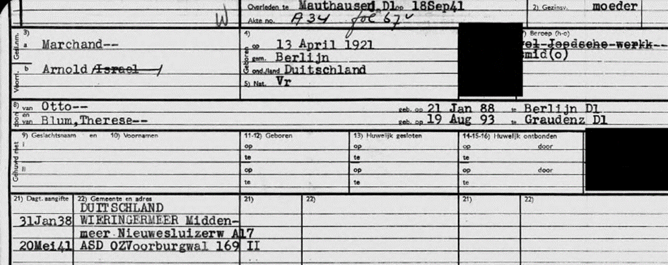 Anfang 1939 Mutter Therese bereits in Amsterdam, Oudezijds Voorburgwal 169 II; Vater Otto nach Unfall eingewiesen in die jüdische Klinik Apeldoornsche Bosch, Nervenklinik