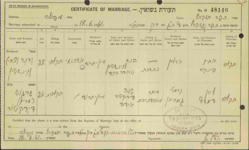 Heirat 18.6.1941 in Kfa Jezekel mit Margot Direktor *21.2.1915 in Elbing; ✡2010 Haifa
