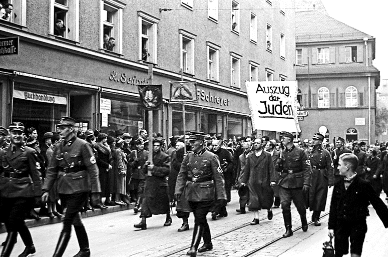 10.11.1938 Es folgte der „Schandmarsch“ durch die Regensburger Altstadt zum Bahnhof. Auf Lastwagen wurden 65 in „Schutzhaft“ genommene Juden ins Konzentrationslager Dachau, ein Teil aber auch in das Regensburger Gefängnis „Augustenburg“ verbracht.