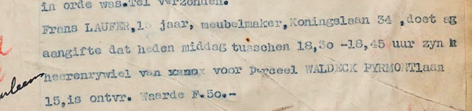 3.7.1941 Franz Laufer, Koningslaan 34 zeigt den Diebstahl seines Fahrrades an