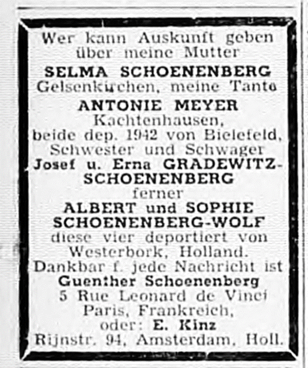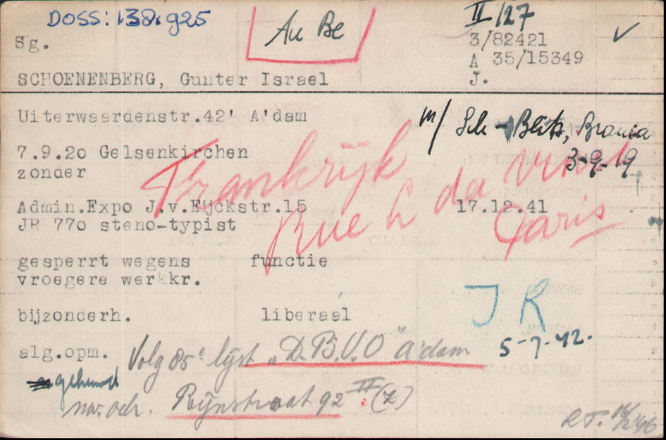 Sommer 1943 Das Ehepaar Günter und Branca Schönenberg steht auf der Au Be -Liste; diese Ausnahmebescheinigungsliste wurde im Auftrag von SS Hauptsturmführer Ferdinand Aus der Fünten, Leiter der Zentralstelle für jüdische Auswanderung für die engsten 170 Mitarbeiter des Amsterdamer Judenrat erstellt. Sie durften bis auf weiteres nicht deportiert werden.