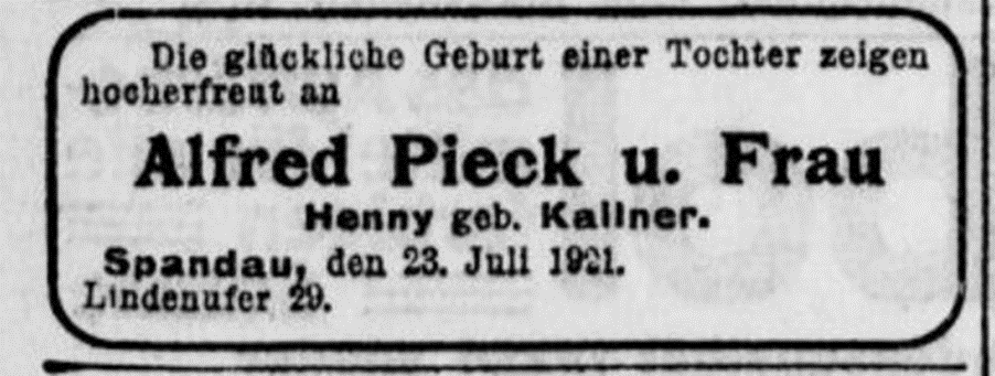 2.Ehe 13.5.1960 in San Francisco mit Ilse Pieck *23.7.1921in Berlin; ✡15.6.2008 in San Francisco