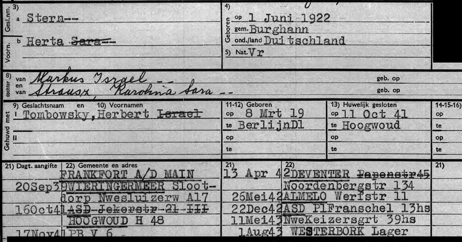 26.5.1943 die Bewohner des Jeugdhuis Franschelaan werden bei einer Razzia verhaftet und nach Westerbork deportiert; Herta und Herbert Tombowski eingewiesen in das polizeiliche Judendurchgangslager zusammen mit Martha Eibschütz, Kurt Elias, Ruth Karlsberg, Ernst Rosenbaum, Grete Schramm, Norbert Schweitzer, Martin Uffenheimer, alle Baracke 60