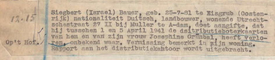 7.4.1941 Siegbert Bauer meldet auf der Polizeiwache den Verlust vm Butterzuteilungskarten