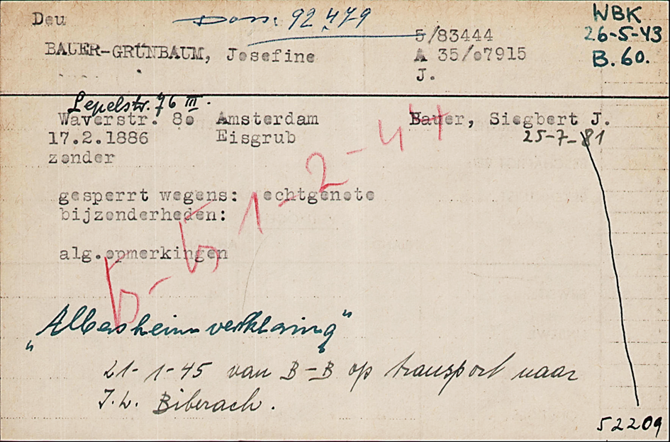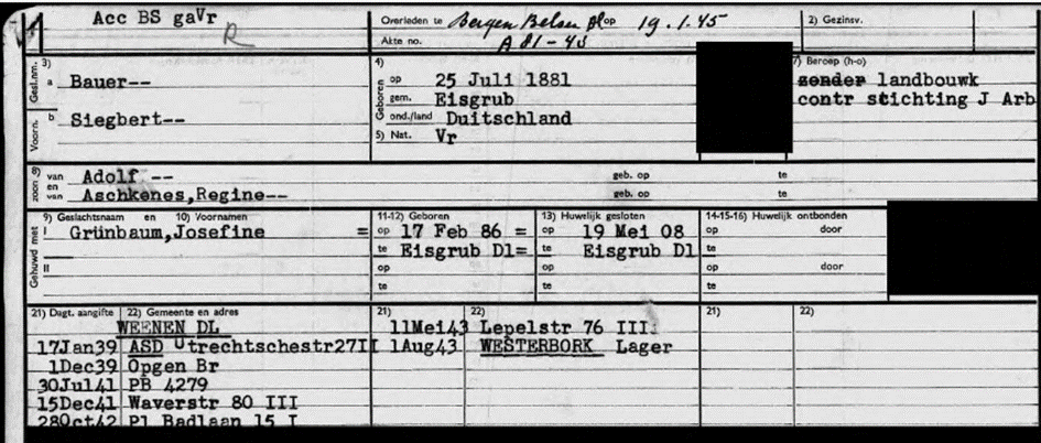 26.5.1943 Einweisung von Siegbert und Josefine Bauer in das polizeiliche Judendurchgangslager Westerbork
