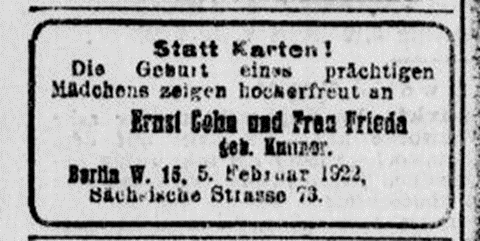 Mutter Erna Neumann *1887 in Berlin; ✡ 14.9.1919 in Berlin