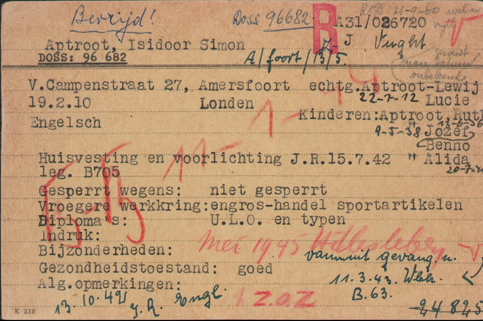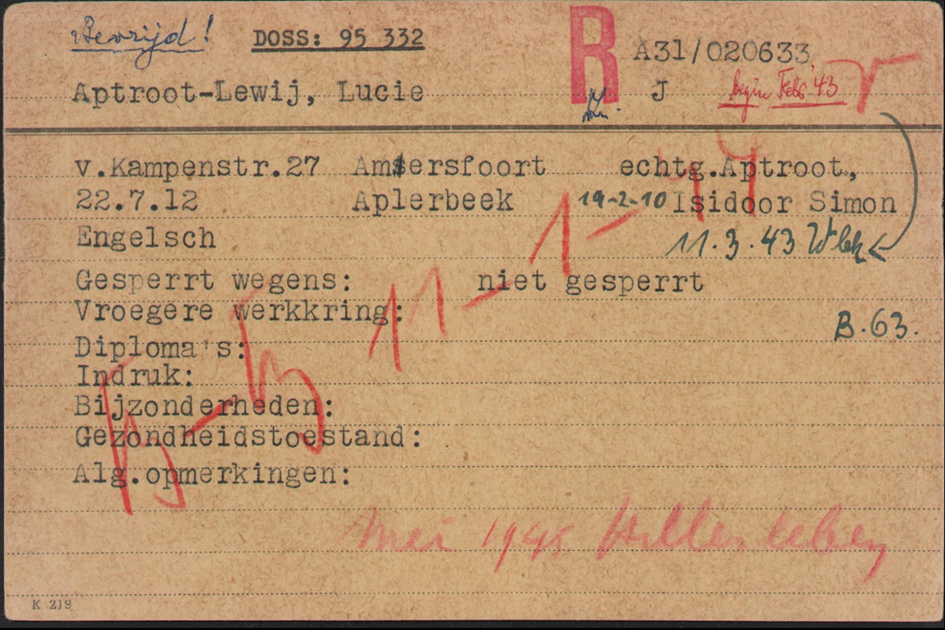 Anfang Februar 1943 Einweisung der Familie Aptroot ins KL Vught; Isidoor Aptroot aus dem Gefängnis 1.3.1943 Lucie mit Mann und drei Kindern verlegt in das polizeiliche Judendurchgangslager Westerbork, Baracke 63
