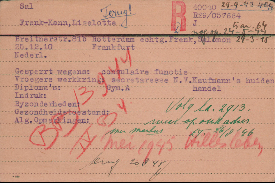 Heirat 7.4.1938 in Rotterdam mit Salomon Frenk *29.3.1915 in Rotterdam; 2.11.1999 in Rotterdam