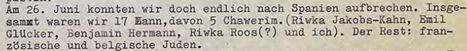 25.7.1944 Der Übergang über die Pyrenäen gelingt erst im vierten Anlauf. Zur Gruppe gehören neben 25 Franzosen 13 Chawerim aus den Niederlanden: Fiet Andriessen, Betty Britz, Lodi Cohen und Lilo Spiegel (-Cohen), Heinz Durlacher und Ruth Durlacher, Emil Glücker, Ludi Goldwein, Benjamin Jürgen Hermann, Rivka Roos, Lore Süsskind, Betteke Tal und Flora de Vries.